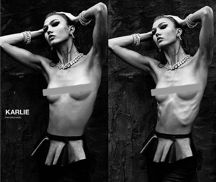 Perhaps people will start trusting magazines and the images they see if they stopped photoshopping everything to distort the truth, who can forget the uproar Karlie Kloss created in Numero magazine when they photoshopped her protruding rib cage OUT of the picture to make her look boneless…if a model is too thin, use another model… God knows there’s millions of them out there.
